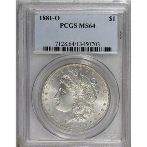 <B>1881-O $1 MS64 PCGS.</B></I> PCGS Population (2472/453). NGC Census: (3244/444). Mintage: 5,708,000. Numismedia Wsl. Price for NGC/PCGS coin in MS64: $135. (#7128)<BR><BR><B>Coin Engraver:</B> George T. Morgan<BR><BR><b>Shipping:</b> Coins & Currency (<a target="_blank" href="http://www.heritageauctions.com/common/shipping.php">view shipping information</a>)