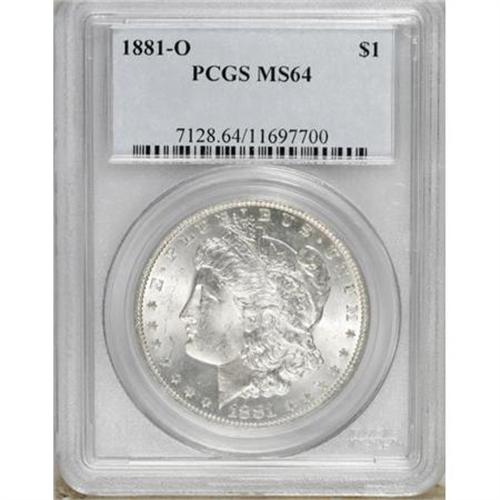 <B>1881-O $1 MS64 PCGS.</B></I> PCGS Population (2505/470). NGC Census: (3268/442). Mintage: 5,708,000. Numismedia Wsl. Price for NGC/PCGS coin in MS64: $135. (#7128)<BR><BR><B>Coin Engraver:</B> George T. Morgan<BR><BR><b>Shipping:</b> Coins & Currency (<a target="_blank" href="http://www.heritageauctions.com/common/shipping.php">view shipping information</a>)