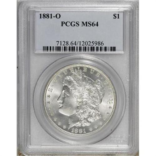 <B>1881-O $1 MS64 PCGS.</B></I> . PCGS Population (2540/488). NGC Census: (3299/448). Mintage: 5,708,000. Numismedia Wsl. Price for NGC/PCGS coin in MS64: $135. (#7128)<BR><BR><B>Coin Engraver:</B> George T. Morgan<BR><BR><b>Shipping:</b> Coins & Currency (<a target="_blank" href="http://www.heritageauctions.com/common/shipping.php">view shipping information</a>)