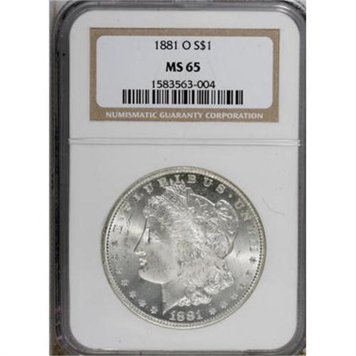 <B>1881-O $1 MS65 NGC.</B></I> The 1881-O Morgan dollar commands a price comparable to its more available S-mint counterpart through Select Mint State, but the former is elusive in Gem. Both sides of this flashy example show frosty, boldly impressed devices. Traces of milky patina mingle with faint traces of iridescence.<BR><BR><B>Coin Engraver:</B> George T. Morgan<BR><BR><b>Shipping:</b> Coins & Currency (<a target="_blank" href="http://www.heritageauctions.com/common/shipping.php">view shipping information</a>)