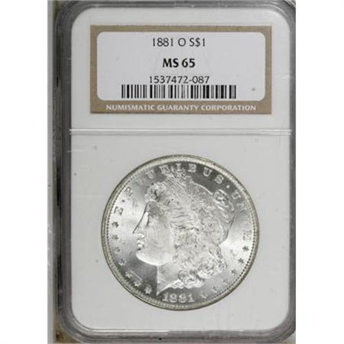 <B>1881-O $1 MS65 NGC.</B></I> An extraordinary piece with amazing mint frost and full brilliance on each side, save for a small splash of vibrant gold at 5 o'clock on the reverse.<BR><BR><B>Coin Engraver:</B> George T. Morgan<BR><BR><b>Shipping:</b> Coins & Currency (<a target="_blank" href="http://www.heritageauctions.com/common/shipping.php">view shipping information</a>)