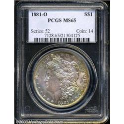 <TABLE cellSpacing=0 cellPadding=0 width="100%" bgColor=#000000 border=0><TBODY><TR><TD width="100%"><TABLE cellSpacing=1 cellPadding=3 width="100%" border=0><TBODY><TR><TD width="100%" bgColor=#79735c><FONT face=arial color=#ffffff size=3><B>Description</B> </FONT></TD></TR><TR><TD width="100%" bgColor=#ffffff><FONT face=arial size=2><B>1881-O $1 MS65 PCGS.</B></I> A killer piece with the combination of scarcity and eye appeal. While the reverse is practically white with only gold coloration around the reverse, the obverse is spectacularly toned with unusual shades of violet, ice-blue, and yellow patina. </FONT></TD></TR></TBODY></TABLE></TD></TR></TBODY></TABLE><BR><A name=PricesRealized></A><TABLE cellSpacing=0 cellPadding=0 width="100%" bgColor=#000000 border=0><TBODY><TR><TD width="100%"><TABLE cellSpacing=1 cellPadding=3 width="100%" border=0><TBODY><TR><TD width="100%" bgColor=#79735c><A name=PR><FONT face=arial color=#ffffff size=3><B>Previous Prices from Heritage Auctions</B> </FONT></A></TD></TR><TR><TD bgColor=#f6f6ed><TABLE cellSpacing=0 cellPadding=0 width="100%" border=1><TBODY><TR><TD align=middle width="33%"><B>Date</B></TD><TD align=middle width="33%"><B>Service</B></TD><TD align=middle width="33%"><B>Price</B></TD></TR><TR bgColor=whitesmoke><TD width="33%"><B>10/06/2001</B></TD><TD width="33%">NGC</TD><TD width="33%">$718.75</TD></TR><TR bgColor=whitesmoke><TD width="33%"><B>10/06/2001</B></TD><TD width="33%">NGC</TD><TD width="33%">$718.75</TD></TR><TR bgColor=whitesmoke><TD width="33%"><B>08/08/2001</B></TD><TD width="33%">NGC</TD><TD width="33%">$920.00</TD></TR><TR bgColor=whitesmoke><TD width="33%"><B>12/28/1999</B></TD><TD width="33%">NGC</TD><TD width="33%">$975.00</TD></TR><TR bgColor=whitesmoke><TD width="33%"><B>12/28/1999</B></TD><TD width="33%">NGC</TD><TD width="33%">$975.00</TD></TR><TR bgColor=whitesmoke><TD width="33%"><B>03/02/2000</B></TD><TD width="33%">NGC</TD><TD width="33%">$920.00</TD></TR><TR bgColor=whitesmoke><TD width="33%"><B>01/07/2000</B></TD><TD width="33%">NGC</TD><TD width="33%">$1,092.50</TD></TR><TR bgColor=whitesmoke><TD width="33%"><B>01/07/2000</B></TD><TD width="33%">NGC</TD><TD width="33%">$1,092.50</TD></TR><TR bgColor=whitesmoke><TD width="33%"><B>05/01/1999</B></TD><TD width="33%">NGC</TD><TD width="33%">$1,100.00</TD></TR><TR bgColor=whitesmoke><TD width="33%"><B>06/01/2000</B></TD><TD width="33%">NGC</TD><TD width="33%">$863.00</TD></TR><TR bgColor=whitesmoke><TD width="33%"><B>06/01/2000</B></TD><TD width="33%">NGC</TD><TD width="33%">$863.00</TD></TR><TR bgColor=whitesmoke><TD width="33%"><B>05/05/2000</B></TD><TD width="33%">NGC</TD><TD width="33%">$862.50</TD></TR><TR bgColor=whitesmoke><TD width="33%"><B>01/06/1996</B></TD><TD width="33%">NGC</TD><TD width="33%">$742.50</TD></TR><TR bgColor=whitesmoke><TD width="33%"><B>01/06/1996</B></TD><TD width="33%">NGC</TD><TD width="33%">$742.50</TD></TR><TR bgColor=whitesmoke><TD width="33%"><B>07/01/2003</B></TD><TD width="33%">NGC</TD><TD width="33%">$1,092.50</TD></TR><TR bgColor=whitesmoke><TD width="33%"><B>02/13/1998</B></TD><TD width="33%">ANACS</TD><TD width="33%">$357.50</TD></TR><TR bgColor=whitesmoke><TD width="33%"><B>02/13/1998</B></TD><TD width="33%">ANACS</TD><TD width="33%">$357.50</TD></TR><TR bgColor=whitesmoke><TD width="33%"><B>06/06/1997</B></TD><TD width="33%">ANACS</TD><TD width="33%">$368.00</TD></TR><TR bgColor=whitesmoke><TD width="33%"><B>04/04/2000</B></TD><TD width="33%">ANACS</TD><TD width="33%">$1,050.00</TD></TR><TR bgColor=whitesmoke><TD width="33%"><B>04/04/2000</B></TD><TD width="33%">ANACS</TD><TD width="33%">$1,050.00</TD></TR><TR bgColor=whitesmoke><TD width="33%"><B>06/19/2001</B></TD><TD width="33%">ANACS</TD><TD width="33%">$490.00</TD></TR><TR bgColor=whitesmoke><TD width="33%"><B>06/03/2003</B></TD><TD width="33%">PCGS</TD><TD width="33%">$1,207.50</TD></TR><TR bgColor=whitesmoke><TD width="33%"><B>06/03/2003</B></TD><TD width="33%">PCGS</TD><TD width="33%">$1,207.50</TD></TR><TR bgColor=whitesmoke><TD width="33%"><B>01/11/2003</B></TD><TD width="33%">PCGS</TD><TD width="33%">$1,063.75</TD></TR><TR bgColor=whitesmoke><TD width="33%"><B>09/28/2002</B></TD><TD width="33%">PCGS</TD><TD width="33%">$1,265.00</TD></TR><TR bgColor=whitesmoke><TD width="33%"><B>09/28/2002</B></TD><TD width="33%">PCGS</TD><TD width="33%">$1,265.00</TD></TR><TR bgColor=whitesmoke><TD width="33%"><B>02/16/2000</B></TD><TD width="33%">PCGS</TD><TD width="33%">$1,438.00</TD></TR><TR bgColor=whitesmoke><TD width="33%"><B>08/09/2000</B></TD><TD width="33%">PCGS</TD><TD width="33%">$1,495.00</TD></TR><TR bgColor=whitesmoke><TD width="33%"><B>08/09/2000</B></TD><TD width="33%">PCGS</TD><TD width="33%">$1,495.00</TD></TR><TR bgColor=whitesmoke><TD width="33%"><B>01/09/2002</B></TD><TD width="33%">PCGS</TD><TD width="33%">$1,035.00</TD></TR><TR bgColor=whitesmoke><TD width="33%"><B>02/18/2002</B></TD><TD width="33%">PCGS</TD><TD width="33%">$1,035.00</TD></TR><TR bgColor=whitesmoke><TD width="33%"><B>02/18/2002</B></TD><TD width="33%">PCGS</TD><TD width="33%">$1,035.00</TD></TR><TR bgColor=whitesmoke><TD width="33%"><B>05/01/2001</B></TD><TD width="33%">PCGS</TD><TD width="33%">$1,035.00</TD></TR><TR bgColor=whitesmoke><TD width="33%"><B>01/01/2001</B></TD><TD width="33%">PCGS</TD><TD width="33%">$1,150.00</TD></TR><TR bgColor=whitesmoke><TD width="33%"><B>01/01/2001</B></TD><TD width="33%">PCGS</TD><TD width="33%">$1,150.00</TD></TR><TR bgColor=whitesmoke><TD width="33%"><B>02/18/2002</B></TD><TD width="33%">PCGS</TD><TD width="33%">$1,092.00</TD></TR><TR bgColor=whitesmoke><TD width="33%"><B>07/30/2002</B></TD><TD width="33%">PCGS</TD><TD width="33%">$1,495.00</TD></TR><TR bgColor=whitesmoke><TD width="33%"><B>07/30/2002</B></TD><TD width="33%">PCGS</TD><TD width="33%">$1,495.00</TD></TR><TR bgColor=whitesmoke><TD width="33%"><B>07/09/2002</B></TD><TD width="33%">PCGS</TD><TD width="33%">$1,207.50</TD></TR><TR bgColor=whitesmoke><TD width="33%"><B>06/08/2002</B></TD><T