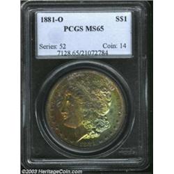 <TABLE cellSpacing=0 cellPadding=0 width="100%" bgColor=#000000 border=0><TBODY><TR><TD width="100%"><TABLE cellSpacing=1 cellPadding=3 width="100%" border=0><TBODY><TR><TD width="100%" bgColor=#79735c><FONT face=arial color=#ffffff size=3><B>Description</B> </FONT></TD></TR><TR><TD width="100%" bgColor=#ffffff><FONT face=arial size=2><B>1881-O $1 MS65 PCGS.</B></I> Beautiful, luminous, multicolored toning is displayed across the obverse in alternating shades of gold, crimson-red, mint-green, and a small patch of gunmetal-blue. The reverse is brilliant white. Well struck overall, the toning all but hides a few inconspicuous luster grazes on the obverse.<BR><I>Ex: The Benson Collection Part II (Ira & Larry Goldberg, 2/2002), lot 599, where it realized $2,587.50.</B></I> </FONT></TD></TR></TBODY></TABLE></TD></TR></TBODY></TABLE><BR><A name=PricesRealized></A><TABLE cellSpacing=0 cellPadding=0 width="100%" bgColor=#000000 border=0><TBODY><TR><TD width="100%"><TABLE cellSpacing=1 cellPadding=3 width="100%" border=0><TBODY><TR><TD width="100%" bgColor=#79735c><A name=PR><FONT face=arial color=#ffffff size=3><B>Previous Prices from Heritage Auctions</B> </FONT></A></TD></TR><TR><TD bgColor=#f6f6ed><TABLE cellSpacing=0 cellPadding=0 width="100%" border=1><TBODY><TR><TD align=middle width="33%"><B>Date</B></TD><TD align=middle width="33%"><B>Service</B></TD><TD align=middle width="33%"><B>Price</B></TD></TR><TR bgColor=whitesmoke><TD width="33%"><B>10/06/2001</B></TD><TD width="33%">NGC</TD><TD width="33%">$718.75</TD></TR><TR bgColor=whitesmoke><TD width="33%"><B>10/06/2001</B></TD><TD width="33%">NGC</TD><TD width="33%">$718.75</TD></TR><TR bgColor=whitesmoke><TD width="33%"><B>08/08/2001</B></TD><TD width="33%">NGC</TD><TD width="33%">$920.00</TD></TR><TR bgColor=whitesmoke><TD width="33%"><B>12/28/1999</B></TD><TD width="33%">NGC</TD><TD width="33%">$975.00</TD></TR><TR bgColor=whitesmoke><TD width="33%"><B>12/28/1999</B></TD><TD width="33%">NGC</TD><TD width="33%">$975.00</TD></TR><TR bgColor=whitesmoke><TD width="33%"><B>03/02/2000</B></TD><TD width="33%">NGC</TD><TD width="33%">$920.00</TD></TR><TR bgColor=whitesmoke><TD width="33%"><B>01/07/2000</B></TD><TD width="33%">NGC</TD><TD width="33%">$1,092.50</TD></TR><TR bgColor=whitesmoke><TD width="33%"><B>01/07/2000</B></TD><TD width="33%">NGC</TD><TD width="33%">$1,092.50</TD></TR><TR bgColor=whitesmoke><TD width="33%"><B>05/01/1999</B></TD><TD width="33%">NGC</TD><TD width="33%">$1,100.00</TD></TR><TR bgColor=whitesmoke><TD width="33%"><B>06/01/2000</B></TD><TD width="33%">NGC</TD><TD width="33%">$863.00</TD></TR><TR bgColor=whitesmoke><TD width="33%"><B>06/01/2000</B></TD><TD width="33%">NGC</TD><TD width="33%">$863.00</TD></TR><TR bgColor=whitesmoke><TD width="33%"><B>05/05/2000</B></TD><TD width="33%">NGC</TD><TD width="33%">$862.50</TD></TR><TR bgColor=whitesmoke><TD width="33%"><B>01/06/1996</B></TD><TD width="33%">NGC</TD><TD width="33%">$742.50</TD></TR><TR bgColor=whitesmoke><TD width="33%"><B>01/06/1996</B></TD><TD width="33%">NGC</TD><TD width="33%">$742.50</TD></TR><TR bgColor=whitesmoke><TD width="33%"><B>07/01/2003</B></TD><TD width="33%">NGC</TD><TD width="33%">$1,092.50</TD></TR><TR bgColor=whitesmoke><TD width="33%"><B>02/13/1998</B></TD><TD width="33%">ANACS</TD><TD width="33%">$357.50</TD></TR><TR bgColor=whitesmoke><TD width="33%"><B>02/13/1998</B></TD><TD width="33%">ANACS</TD><TD width="33%">$357.50</TD></TR><TR bgColor=whitesmoke><TD width="33%"><B>06/06/1997</B></TD><TD width="33%">ANACS</TD><TD width="33%">$368.00</TD></TR><TR bgColor=whitesmoke><TD width="33%"><B>04/04/2000</B></TD><TD width="33%">ANACS</TD><TD width="33%">$1,050.00</TD></TR><TR bgColor=whitesmoke><TD width="33%"><B>04/04/2000</B></TD><TD width="33%">ANACS</TD><TD width="33%">$1,050.00</TD></TR><TR bgColor=whitesmoke><TD width="33%"><B>06/19/2001</B></TD><TD width="33%">ANACS</TD><TD width="33%">$490.00</TD></TR><TR bgColor=whitesmoke><TD width="33%"><B>06/03/2003</B></TD><TD width="33%">PCGS</TD><TD width="33%">$1,207.50</TD></TR><TR bgColor=whitesmoke><TD width="33%"><B>06/03/2003</B></TD><TD width="33%">PCGS</TD><TD width="33%">$1,207.50</TD></TR><TR bgColor=whitesmoke><TD width="33%"><B>01/11/2003</B></TD><TD width="33%">PCGS</TD><TD width="33%">$1,063.75</TD></TR><TR bgColor=whitesmoke><TD width="33%"><B>09/28/2002</B></TD><TD width="33%">PCGS</TD><TD width="33%">$1,265.00</TD></TR><TR bgColor=whitesmoke><TD width="33%"><B>09/28/2002</B></TD><TD width="33%">PCGS</TD><TD width="33%">$1,265.00</TD></TR><TR bgColor=whitesmoke><TD width="33%"><B>02/16/2000</B></TD><TD width="33%">PCGS</TD><TD width="33%">$1,438.00</TD></TR><TR bgColor=whitesmoke><TD width="33%"><B>08/09/2000</B></TD><TD width="33%">PCGS</TD><TD width="33%">$1,495.00</TD></TR><TR bgColor=whitesmoke><TD width="33%"><B>08/09/2000</B></TD><TD width="33%">PCGS</TD><TD width="33%">$1,495.00</TD></TR><TR bgColor=whitesmoke><TD width="33%"><B>01/09/2002</B></TD><TD width="33%">PCGS</TD><TD width="33%">$1,035.00</TD></TR><TR bgColor=whitesmoke><TD width="33%"><B>02/18/2002</B></TD><TD width="33%">PCGS</TD><TD width="33%">$1,035.00</TD></TR><TR bgColor=whitesmoke><TD width="33%"><B>02/18/2002</B></TD><TD width="33%">PCGS</TD><TD width="33%">$1,035.00</TD></TR><TR bgColor=whitesmoke><TD width="33%"><B>05/01/2001</B></TD><TD width="33%">PCGS</TD><TD width="33%">$1,035.00</TD></TR><TR bgColor=whitesmoke><TD width="33%"><B>01/01/2001</B></TD><TD width="33%">PCGS</TD><TD width="33%">$1,150.00</TD></TR><TR bgColor=whitesmoke><TD width="33%"><B>01/01/2001</B></TD><TD width="33%">PCGS</TD><TD width="33%">$1,150.00</TD></TR><TR bgColor=whitesmoke><TD width="33%"><B>02/18/2002</B></TD><TD width="33%">PCGS</TD><TD width="33%">$1,092.00</TD></TR><TR bgColor=whitesmoke><TD width="33%"><B>07/30/2002</B></TD><TD width="33%">PCGS</TD><TD width="33%">$1,495.00</TD></TR><TR bgColor=whitesmoke><TD width="33%"><B>07/30/2002</B></TD><TD width="33%">PCGS</TD><TD width="33%">$1,495.00</TD></TR><TR bgColor=white