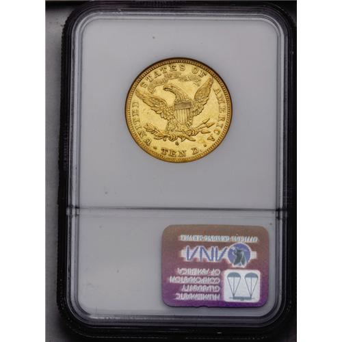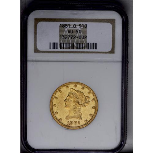 <B>1881-O<$10> AU50 NGC.</B></I> Substantial luster outlines the borders and devices. A vertical thin scratch beneath the hair bun limits the grade. Just 8,350 pieces were struck for this rarely encountered New Orleans issue.