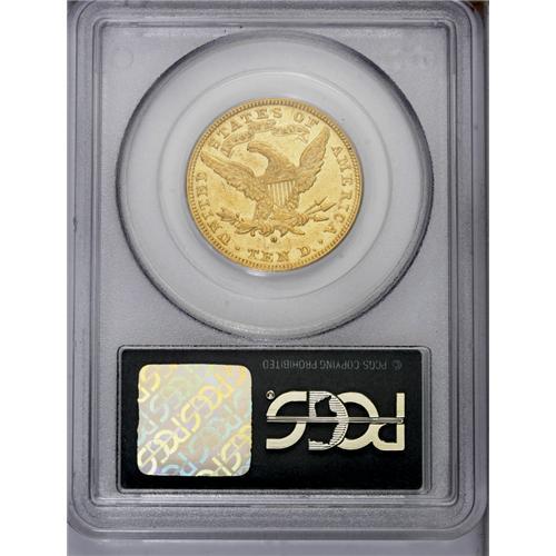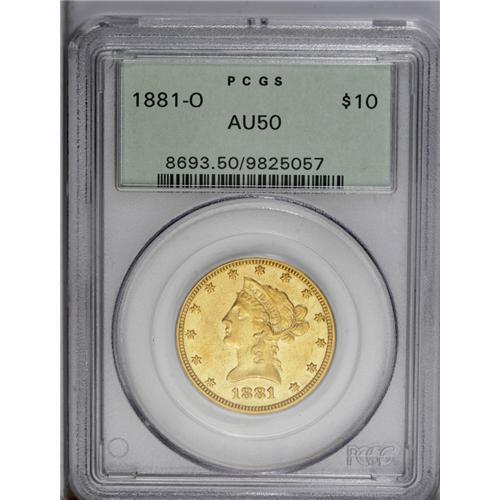 <B>1881-O<$10> AU50 PCGS.</B></I> A scarce late date O-mint and one of just 8,350 pieces minted. Original red-gold surfaces with greenish undertones. Well struck with numerous light to moderate abrasions in the semi-prooflike fields. This example is encapsulated in an earlier PCGS holder with a green label. Population: 14 in 50, 26 finer (7/06).