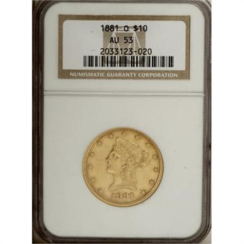 <B>1881-O $10 AU53 NGC.</B></I> A boldly detailed piece that has no shortage of luster throughout the stars and devices. Moderately abraded but highly elusive, with the mintage of 8,350 pieces just one factor. Census: 23 in 53, 65 finer (12/07).<BR><BR><B>Coin Engraver:</B> Christian Gobrecht<BR><BR><b>Shipping:</b> Coins & Currency (<a target="_blank" href="http://www.heritageauctions.com/common/shipping.php">view shipping information</a>)