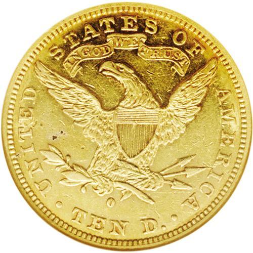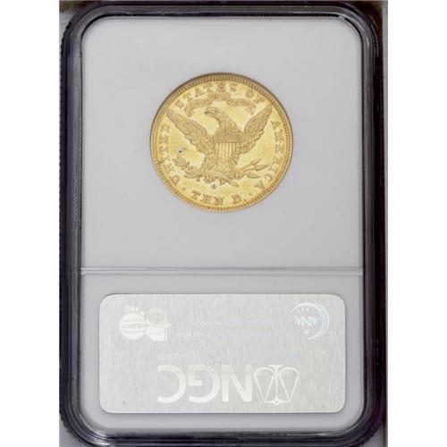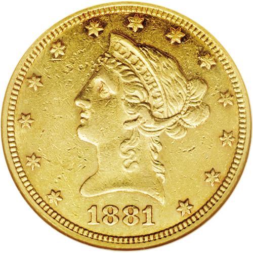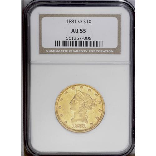<B>1881-O<$10> AU55 NGC.</B></I> The New Orleans Mint issued eagles annually between 1879, when the mint reopened, and 1883. The first and last of these five issues are formidable rarities, and the three in between are hard to find regardless of grade. For the 1881-O, just 8,350 pieces were struck. This moderately abraded example offers substantial semi-prooflike luster, and can be identified by three small pits in line with the I in UNITED.