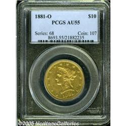 <B>1881-O $10 AU55 PCGS.</B></I> A scarce late date O-mint product, and one of just 8,350 pieces minted. The bright prooflike fields are peppered with numerous small abrasions. Light green-gold color adorns each side. Population: 6 in 55, 5 finer (2/05).