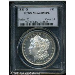 <B>1881-O<img border='0' src='http://www.heritagecoins.com/images/star.gif' width=10 height=10>$1 MS64 Deep Mirror Prooflike PCGS.</B></I> Brilliant white with nicely struck, frosty devices and a pleasing cameo appearance. A few minor contact marks limit the grade. Lot:10047