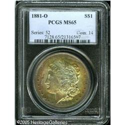 <B>1881-O<img border='0' src='http://www.heritagecoins.com/images/star.gif' width=10 height=10>$1 MS65 PCGS.</B></I> Vivid olive-green, ruby-red, and lemon colors dominate the margins of this sharply struck and reasonably preserved Silver Dollar. Lot:10043