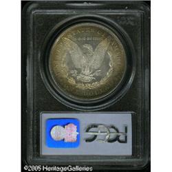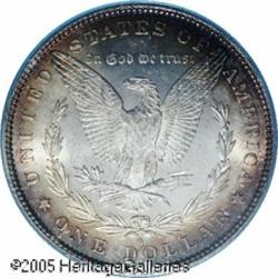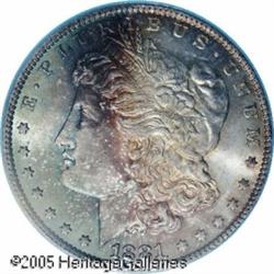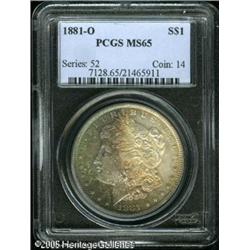 <B>1881-O<img border='0' src='http://www.heritagecoins.com/images/star.gif' width=10 height=10>$1 MS65 PCGS.</B></I> With a mintage of 5.7 million pieces, the 1881-O should be more available than it is, but only 303 coins have been certified in Gem condition by PCGS with nine finer (1/05). This is a singularly impressive coin that displays iridescent sea-green, brown, and golden stripes of color on the left side of the obverse with the right side brilliant. The center of the reverse is brilliant but is surrounded by golden-brown and cobalt-blue marginal toning. Sharply struck for the issue, only the smallest abrasions are evident and they are well concealed by the toning on the obverse.<BR><I>From The Banks Collection.</B></I> Lot:10044