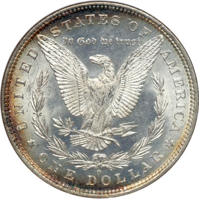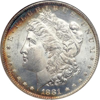 1881-O Morgan Dollar. NGC graded MS-65. Plenty of frosty mint luster. Light gold and blue obverse toning around the borders. A vibrant Gem (PCGS # 7128).