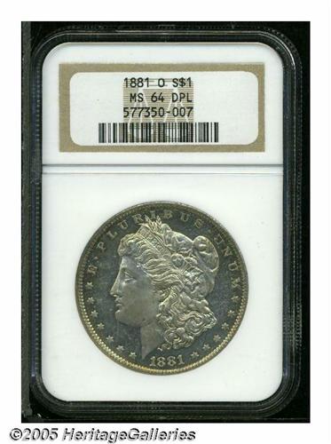 <B>1881-O<S$1> MS64 Deep Mirror Prooflike NGC.</B></I> A veil of light-russet toning is found around the rims and on the main devices, serving to further enhance the contrast between the design elements and highly reflective fields. Nicely struck, save for minor softness in Liberty's hair over the ear. A few minor marks are apparent on Liberty's eyebrow and nose, though none are serious. Population: 58 in 64 Deep Mirror Prooflike, 1 finer (6/05).