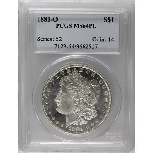 <B>1881-O<img border='0' src='http://www.heritagecoins.com/images/star.gif' width=10 height=10>$1> MS64 Prooflike PCGS.</B></I> Well struck and frosty, with a slight haze on the mirrored fields. Light abrasions on Liberty's cheek are consistent with the grade.<BR><I>From The Chicago-Ark Collection.</B></I>