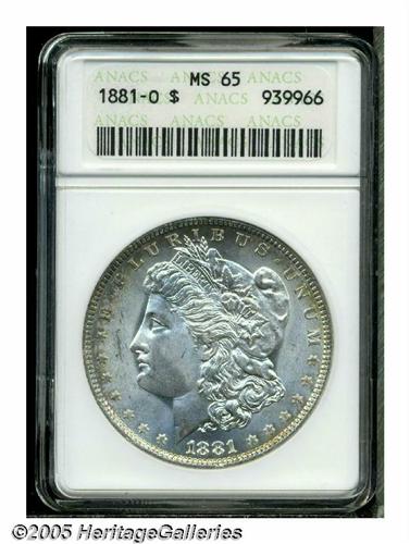 <B>1881-O<S$1> MS65 ANACS.</B></I> Well struck with bright chrome-like luster, untoned centers, and mild, attractive peripheral toning on both sides. The few small, scattered marks are consistent with the assigned grade.