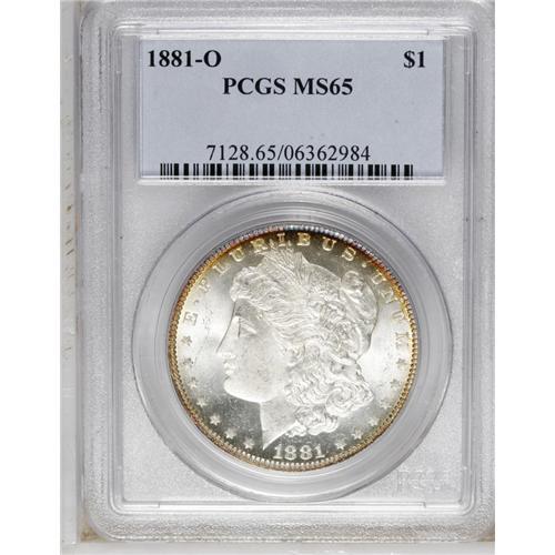 <B>1881-O<img border='0' src='http://www.heritagecoins.com/images/star.gif' width=10 height=10>$1> MS65 PCGS.</B></I> An exquisitely struck Gem that has mildly reflective fields and lovely red, gold, and electric-blue peripheral toning. The well-preserved surfaces have scattered wispy marks, mostly in the fields.