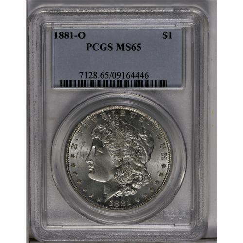 <B>1881-O<img border='0' src='http://www.heritagecoins.com/images/star.gif' width=10 height=10>$1> MS65 PCGS.</B></I> The 1881-O is plentiful in MS61 to MS64 grades, but Gems are surprisingly difficult to find. This lustrous and beautiful example is intricately struck, and would achieve an even higher grade were it not for a solitary slender diagonal mark on the cheek.<BR><I>From The Jackson Hole Collection.</B></I>