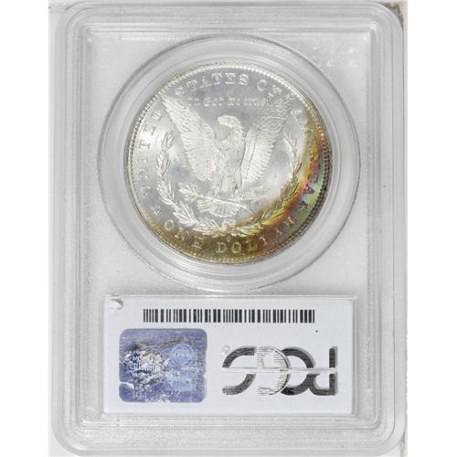 <B>1881-O<img border='0' src='http://www.heritagecoins.com/images/star.gif' width=10 height=10>$1> MS65 PCGS.</B></I> The obverse is fully brilliant, while the reverse has vibrant crescent toning from 2 to 8 o'clock. Yellow-orange, plum, and lime appear on this sharply struck piece.