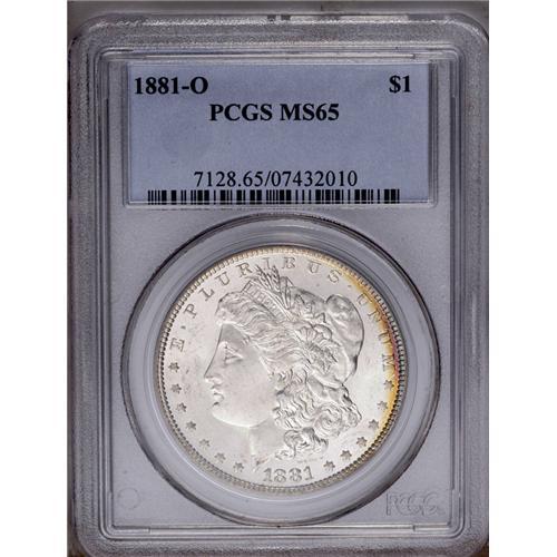 <B>1881-O<img border='0' src='http://www.heritagecoins.com/images/star.gif' width=10 height=10>$1> MS65 PCGS.</B></I> Thin bands of bright lemon and plum toning endow the right obverse border, but most of this crisply struck Gem is untoned. Refreshingly smooth, and surprisingly rare any finer. NGC and PCGS combined have only certified 18 pieces above MS65.