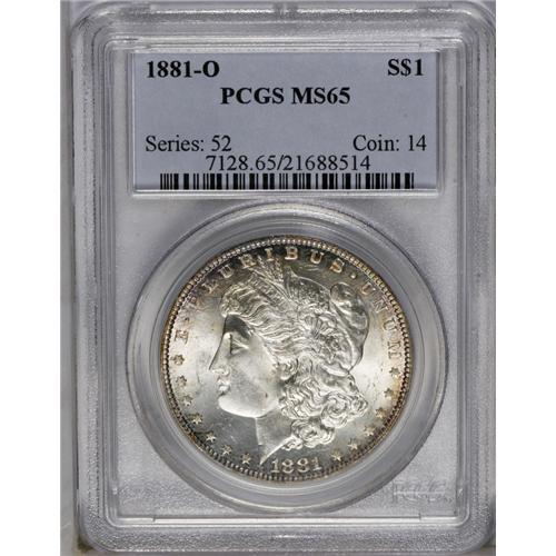 <B>1881-O<img border='0' src='http://www.heritagecoins.com/images/star.gif' width=10 height=10>$1> MS65 PCGS.</B></I> This Gem is toned at the periphery in blue, violet, and gold. Attractive luster and a solid strike, combined with minimal abrasions, give this coin winning eye appeal.<BR><I>From The Chicago-Ark Collection.</B></I>