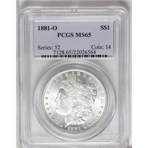 <B>1881-O<img border='0' src='http://www.heritagecoins.com/images/star.gif' width=10 height=10>$1> MS65 PCGS.</B></I> This brilliant Gem has frosty white luster and excellent eye appeal. The quality is exceptional for the grade. Only 10 finer examples have been certified by PCGS (8/06).
