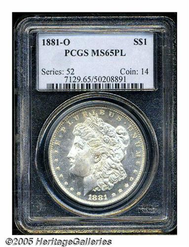 <B>1881-O<S$1> MS65 Prooflike PCGS.</B></I> Highly attractive Gem example with some faint golden color. A few light abrasions are noted, but all are minor and impact the bright fields and lightly frosted devices little.