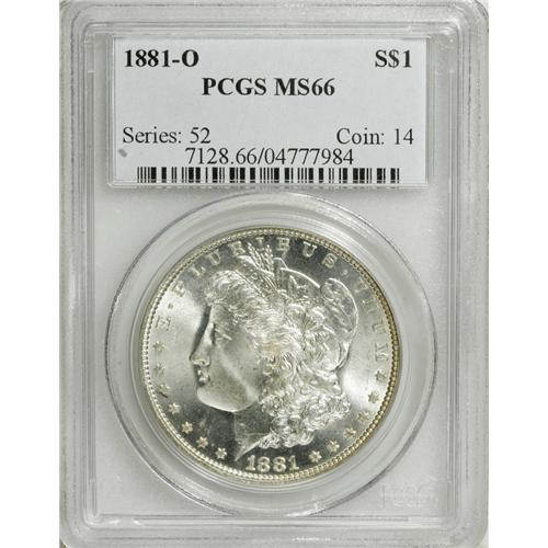 <B>1881-O S$1 MS66 PCGS.</B></I> Several die cracks can be seen on each side of this Morgan dollar, providing evidence of the extensive service of individual dies at the New Orleans Mint. The rarity of high quality New Orleans Mint dollars is directly related to the use and overuse of individual dies. Many dies were spaced slightly too far apart in the press, creating weak strikes, and were also used beyond their reasonable limit of productivity. This pristine Premium Gem is rather sharply detailed and possesses frosty and highly lustrous silver surfaces with a trace of gold toning, especially on the obverse. Population: 11 in 66, 0 finer (2/07).<BR><I>From The Jackson Hole Collection.</B></I><BR><BR><b>Shipping:</b> Coins & Currency (<a target="_blank" href="http://www.heritageauctions.com/common/shipping.php">view shipping information</a>)