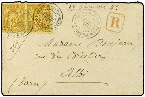 1881 POINTE A PITRE a FRANCIA. Circulada con una pareja del 25 cts. bistre de Colonias. Carta certificada, al dorso fechador maritimo de la LIGNE B. PRECIOSA.