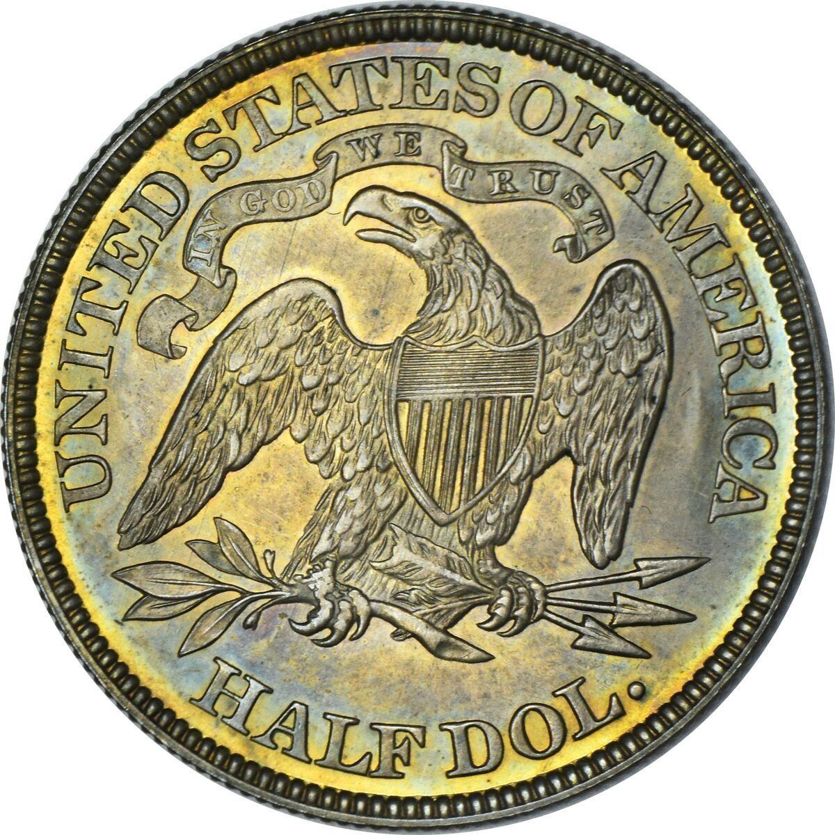 Warm dove-gray throughout with frosty motifs and reflective fields that glow with varied peach, sea-green, and blue iridescence in a bright light source. Scattered toning flecks are noted on both sides. PCGS #6442