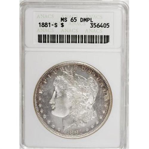 <B>1881-S $1 MS65 Deep Mirror Prooflike ANACS.</B></I> NGC Census: (308/108). PCGS Population (206/76). Numismedia Wsl. Price for NGC/PCGS coin in MS65: $625. (#97131)<BR><BR><b>Shipping:</b> Coins & Currency (<a target="_blank" href="http://www.heritageauctions.com/common/shipping.php">view shipping information</a>)