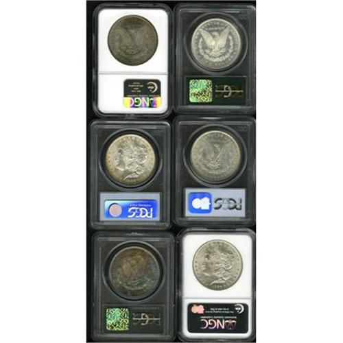 <B>1881-S $1 MS63 Prooflike PCGS,</B></I> the obverse has a wide crescent of rainbow iridescence to the right; <B>1884-O MS63 PCGS,</B></I> the entire obverse is toned with golden-olive, lilac, sky-blue, and sea-green, the reverse is brilliant; <B>1884-O MS63 <img border='0' src='http://www.heritagecoins.com/images/star.gif' width=10 height=10> NGC, </B></I>the obverse is brilliant, the reverse has a splendid display of rainbow toning in three distinct sections; <B>1885-O MS63 PCGS, </B></I>the brilliant obverse has a thin crescent of pale gold from 5 o'clock to 9 o'clock, the reverse has vivid gold, lilac, green, and blue toning over an over of brilliance; <B>1885-O MS63<img border='0' src='http://www.heritagecoins.com/images/star.gif' width=10 height=10> NGC, </B></I>both sides are toned, the obverse with pastel gold, lilac, blue, and green, the reverse with bluish-gray splashed by lighter gold; <B>1887 MS63 PCGS, </B></I>lustrous and brilliant obverse with an unusual pattern of iridescent toning on the reverse.<BR><BR><B>Coin Engraver:</B> George T. Morgan<BR><BR><b>Shipping:</b> Coins & Currency (<a target="_blank" href="http://www.heritageauctions.com/common/shipping.php">view shipping information</a>)