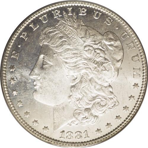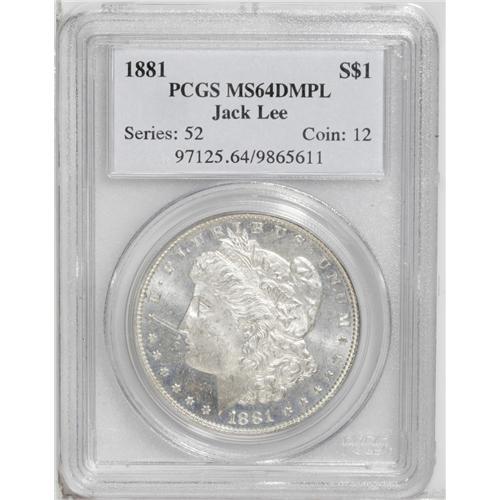 <B>1881<img border='0' src='http://www.heritagecoins.com/images/star.gif' width=10 height=10>$1> MS64 Deep Mirror Prooflike PCGS.</B></I> Ex: Jack Lee Collection. A near-Gem with good contrast between the frosty devices and the snow-white surfaces. The deeply reflective fields betray a modest number of tiny abrasions, which are also seen on the cheek of Liberty. Still, an expertly struck coin with outstanding eye appeal.