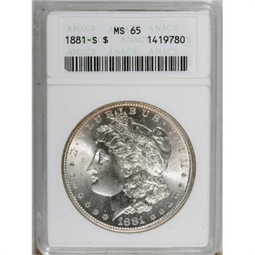 <B>1881-S $1 MS65 ANACS.</B></I> NGC Census: (39444/14469). PCGS Population (40998/11559). Mintage: 12,760,000. Numismedia Wsl. Price for NGC/PCGS coin in MS65: $117. (#7130)<BR><BR><B>Coin Engraver:</B> George T. Morgan<BR><BR><b>Shipping:</b> Coins & Currency (<a target="_blank" href="http://www.heritageauctions.com/common/shipping.php">view shipping information</a>)