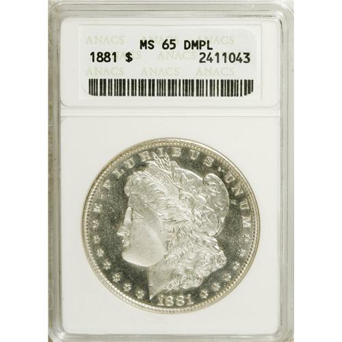 <B>1881 S$1 MS65 Deep Mirror Prooflike ANACS.</B></I> The 1881 is a conditionally challenging Morgan dollar with Deep Mirrored fields and in MS65 condition. This is a fully struck Gem that has glassy, reflective fields with sufficient frost on the devices to give the coin strong cameo contrast. Nearly brilliant overall, there is just the slightest accent of golden color around the peripheries, and the devices are devoid of the usual abrasions and luster breaks.<BR><BR><b>Shipping:</b> Coins & Currency (<a target="_blank" href="http://www.heritageauctions.com/common/shipping.php">view shipping information</a>)