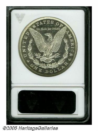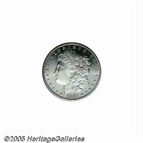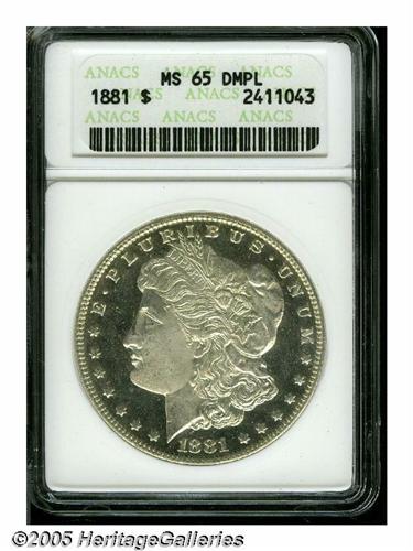 <B>1881<S$1> MS65 Deep Mirror Prooflike ANACS.</B></I> The 1881 is a conditionally challenging Morgan Dollar with deeply mirrored fields and in MS65 condition. This is a fully struck Gem that has glassy, reflective fields with sufficient frost on the devices to give the coin a moderate cameo contrast. Nearly brilliant overall, there is just the slightest accent of golden color around the peripheries, and the devices show only the slightest contact marks and luster grazes.
