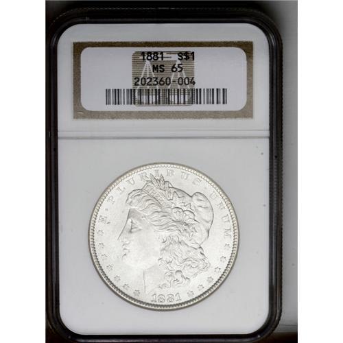 <B>1881<img border='0' src='http://www.heritagecoins.com/images/star.gif' width=10 height=10>$1 MS65 NGC.</B></I> A boldly struck Gem with potent luster and impressively unmarked surfaces. Liberty's cheek is very clean, and most of the coin's small surface blemishes are located on the reverse. A pleasing example, from a somewhat scarcer Philadelphia Mint issue.