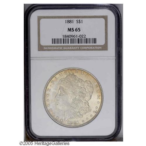 <B>1881<S$1> MS65 NGC.</B></I> Medium tones of rich golden-orange color bathe both sides of this Gem. Issues in Mint State 66 trade for as much as five times more than just regular ol' Gem.