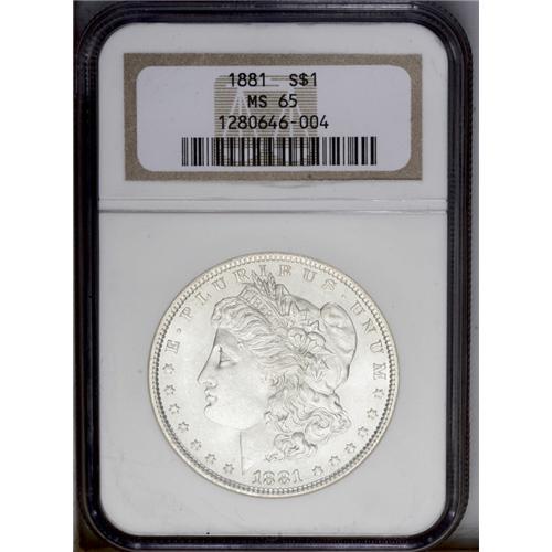 <B>1881<img border='0' src='http://www.heritagecoins.com/images/star.gif' width=10 height=10>$1> MS65 NGC.</B></I> The surfaces exhibit frosty luster and sharply struck design elements, including good definition in the hair over Liberty's ear. Whispers of light tan color visit some of the border areas, especially on the reverse. A few trivial luster grazes on the cheek and neck and in the left obverse field do not distract. NGC has certified 43 pieces finer (3/06). <BR><BR><B>Important notice:</B> Heritage usually auctions material at the rate of 200-250 lots per hour. On some occasions eBay Live bid software or the Internet may not be able to keep up with the pace of the auction. We recommend placing a realistic absentee bid now as insurance to avoid disappointment. Occasionally the auctioneer may eliminate or reject an eBay Live bid, and the auctioneer may also reopen a lot after the close of the eBay live bidding (usually because we missed an audience bid), and may reject your bid even if it shows you as the winning bidder. By bidding via eBay Live, you agree that Heritage may award the lot to another bidder at its sole discretion under the circumstances described above or any other reasonable circumstances. Since eBay bids are not shown to us until we open the lot on the floor, we treat those bids just like floor bids. In most cases the floor responds before the eBay bid is presented to us, due to Internet lag time, so for consistency we have made it a policy that floor bids are always considered first over tie eBay live bids. Also please note that all Heritage lots purchased through eBay Live carry a 20% Buyer's Premium. Please make sure you read the Terms and Conditions before you bid. This lot is being auctioned in conjunction with a live floor auction by Heritage Galleries & Auctioneers. All final auction and invoice information will be supplied by Heritage Galleries & Auctioneers, and all other information should be considered preliminary. Lot:3303 <BR><BR><B>Winning Notification and Billing:</B> After the FINAL session in this auction is complete, Heritage will send e-mail and snail mail invoices. This process normally takes several days. All final auction and invoice information will be supplied by Heritage Galleries & Auctioneers, and all other information should be considered preliminary. <BR><BR>This auction will be conducted on a live auction floor and over the Internet through eBay Live. If you choose to place an absentee bid, please take a moment to <font color='#0000ff'><u><a href='http://pages.ebay.com/liveauctions/help/before/laabsentee.html'>learn how eBay Live absentee bidding works</a></u></font><font color='#000000'>