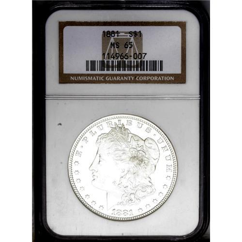 <B>1881<img border='0' src='http://www.heritagecoins.com/images/star.gif' width=10 height=10>$1> MS65 NGC.</B></I> This attractive white Gem reveals just a few minor luster grazes on otherwise well preserved satiny surfaces. Except for weakness in the hair overlying Liberty's ear and on the eagle's breast, the design features are nicely brought up. Only 43 pieces have been certified finer by NGC (3/06). <BR><BR><B>Important notice:</B> Heritage usually auctions material at the rate of 200-250 lots per hour. On some occasions eBay Live bid software or the Internet may not be able to keep up with the pace of the auction. We recommend placing a realistic absentee bid now as insurance to avoid disappointment. Occasionally the auctioneer may eliminate or reject an eBay Live bid, and the auctioneer may also reopen a lot after the close of the eBay live bidding (usually because we missed an audience bid), and may reject your bid even if it shows you as the winning bidder. By bidding via eBay Live, you agree that Heritage may award the lot to another bidder at its sole discretion under the circumstances described above or any other reasonable circumstances. Since eBay bids are not shown to us until we open the lot on the floor, we treat those bids just like floor bids. In most cases the floor responds before the eBay bid is presented to us, due to Internet lag time, so for consistency we have made it a policy that floor bids are always considered first over tie eBay live bids. Also please note that all Heritage lots purchased through eBay Live carry a 20% Buyer's Premium. Please make sure you read the Terms and Conditions before you bid. This lot is being auctioned in conjunction with a live floor auction by Heritage Galleries & Auctioneers. All final auction and invoice information will be supplied by Heritage Galleries & Auctioneers, and all other information should be considered preliminary. Lot:3302 <BR><BR><B>Winning Notification and Billing:</B> After the FINAL session in this auction is complete, Heritage will send e-mail and snail mail invoices. This process normally takes several days. All final auction and invoice information will be supplied by Heritage Galleries & Auctioneers, and all other information should be considered preliminary. <BR><BR>This auction will be conducted on a live auction floor and over the Internet through eBay Live. If you choose to place an absentee bid, please take a moment to <font color='#0000ff'><u><a href='http://pages.ebay.com/liveauctions/help/before/laabsentee.html'>learn how eBay Live absentee bidding works</a></u></font><font color='#000000'>