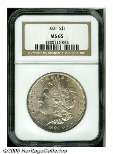 <B>1881<S$1> MS65 NGC.</B></I> Wisps of light tan patina visit lustrous surfaces. The design features are well impressed, except for weakness in the hair above Liberty's ear. Some minute marks on Liberty's cheek are mentioned for accuracy. NGC has certified 41 pieces finer (5/05).