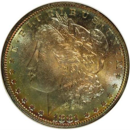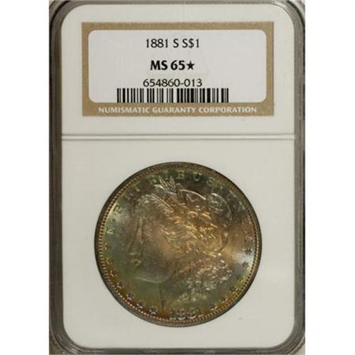 <B>1881-S $1 MS65 <img border='0' src='http://www.heritagecoins.com/images/star.gif' width=10 height=10> NGC.</B></I> NGC Census: (39171/14301). PCGS Population (40719/11423). Mintage: 12,760,000. Numismedia Wsl. Price for NGC/PCGS coin in MS65: $118. (#7130)<BR><BR><B>Coin Engraver:</B> George T. Morgan<BR><BR><b>Shipping:</b> Coins & Currency (<a target="_blank" href="http://www.heritageauctions.com/common/shipping.php">view shipping information</a>\)