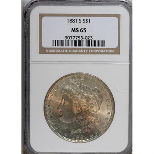 <B>1881-S $1 MS65 NGC.</B></I> NGC Census: (39444/14469). PCGS Population (40980/11529). Mintage: 12,760,000. Numismedia Wsl. Price for NGC/PCGS coin in MS65: $117. (#7130)<BR><BR><B>Coin Engraver:</B> George T. Morgan<BR><BR><b>Shipping:</b> Coins & Currency (<a target="_blank" href="http://www.heritageauctions.com/common/shipping.php">view shipping information</a>)