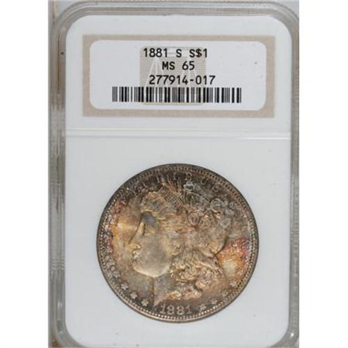 <B>1881-S $1 MS65 NGC.</B></I> NGC Census: (39444/14469). PCGS Population (41029/11582). Mintage: 12,760,000. Numismedia Wsl. Price for NGC/PCGS coin in MS65: $117. (#7130)<BR><BR><B>Coin Engraver:</B> George T. Morgan<BR><BR><b>Shipping:</b> Coins & Currency (<a target="_blank" href="http://www.heritageauctions.com/common/shipping.php">view shipping information</a>)