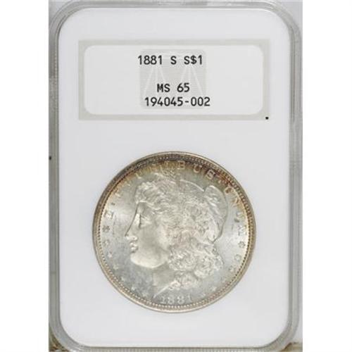 <B>1881-S $1 MS65 NGC.</B></I> NGC Census: (39830/14659). PCGS Population (41039/11600). Mintage: 12,760,000. Numismedia Wsl. Price for NGC/PCGS coin in MS65: $117. (#7130)<BR><BR><B>Coin Engraver:</B> George T. Morgan<BR><BR><b>Shipping:</b> Coins & Currency (<a target="_blank" href="http://www.heritageauctions.com/common/shipping.php">view shipping information</a>)