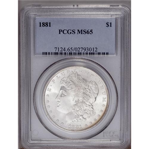 <B>1881<img border='0' src='http://www.heritagecoins.com/images/star.gif' width=10 height=10>$1 MS65 PCGS.</B></I> A gorgeous Gem with bright silver luster and a hint of gold toning along the lower obverse border. A similar trace of gold can be seen on the reverse border at 4 o'clock. The surfaces are frosty and the cheek is clean. Just 48 finer examples have been certified by PCGS (1/06).