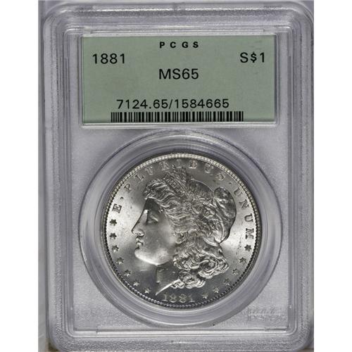 <B>1881<img border='0' src='http://www.heritagecoins.com/images/star.gif' width=10 height=10>$1> MS65 PCGS.</B></I> A solidly struck Gem with satiny and essentially untoned surfaces. A noteworthy abrasion found on the reverse runs from the eagle's right (facing) wing into the breast and tail.<BR><I>From The Chicago-Ark Collection.</B></I>