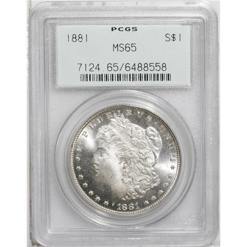<B>1881<img border='0' src='http://www.heritagecoins.com/images/star.gif' width=10 height=10>$1> MS65 PCGS.</B></I> Delicate chestnut tints adorn this flashy and undisturbed Gem. The centers show a hint of incompleteness, but the remainder of the designs are intricate. Encapsulated in an old green label holder.