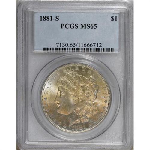 <B>1881-S $1 MS65 PCGS.</B></I> PCGS Population (40719/11423). NGC Census: (39171/14301). Mintage: 12,760,000. Numismedia Wsl. Price for NGC/PCGS coin in MS65: $118. (#7130)<BR><BR><B>Coin Engraver:</B> George T. Morgan<BR><BR><b>Shipping:</b> Coins & Currency (<a target="_blank" href="http://www.heritageauctions.com/common/shipping.php">view shipping information</a>\)