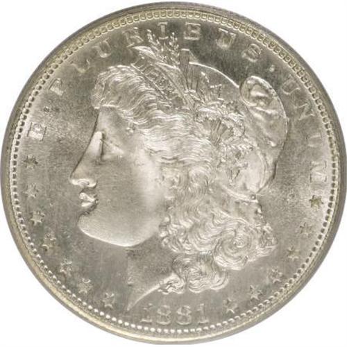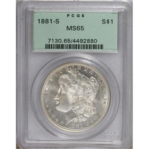 <B>1881-S $1 MS65 PCGS.</B></I> PCGS Population (40719/11423). NGC Census: (39171/14301). Mintage: 12,760,000. Numismedia Wsl. Price for NGC/PCGS coin in MS65: $118. (#7130)<BR><BR><B>Coin Engraver:</B> George T. Morgan<BR><BR><b>Shipping:</b> Coins & Currency (<a target="_blank" href="http://www.heritageauctions.com/common/shipping.php">view shipping information</a>\)