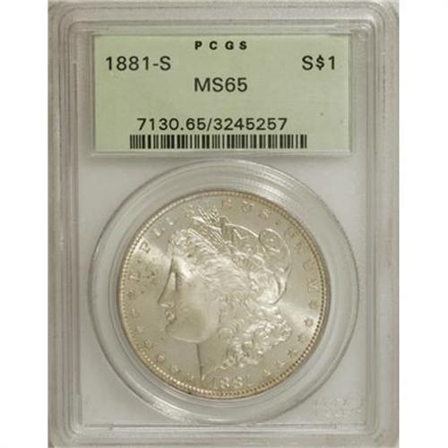 <B>1881-S $1 MS65 PCGS.</B></I> PCGS Population (40896/11496). NGC Census: (39262/14393). Mintage: 12,760,000. Numismedia Wsl. Price for NGC/PCGS coin in MS65: $118. (#7130)<BR><BR><B>Coin Engraver:</B> George T. Morgan<BR><BR><b>Shipping:</b> Coins & Currency (<a target="_blank" href="http://www.heritageauctions.com/common/shipping.php">view shipping information</a>\)